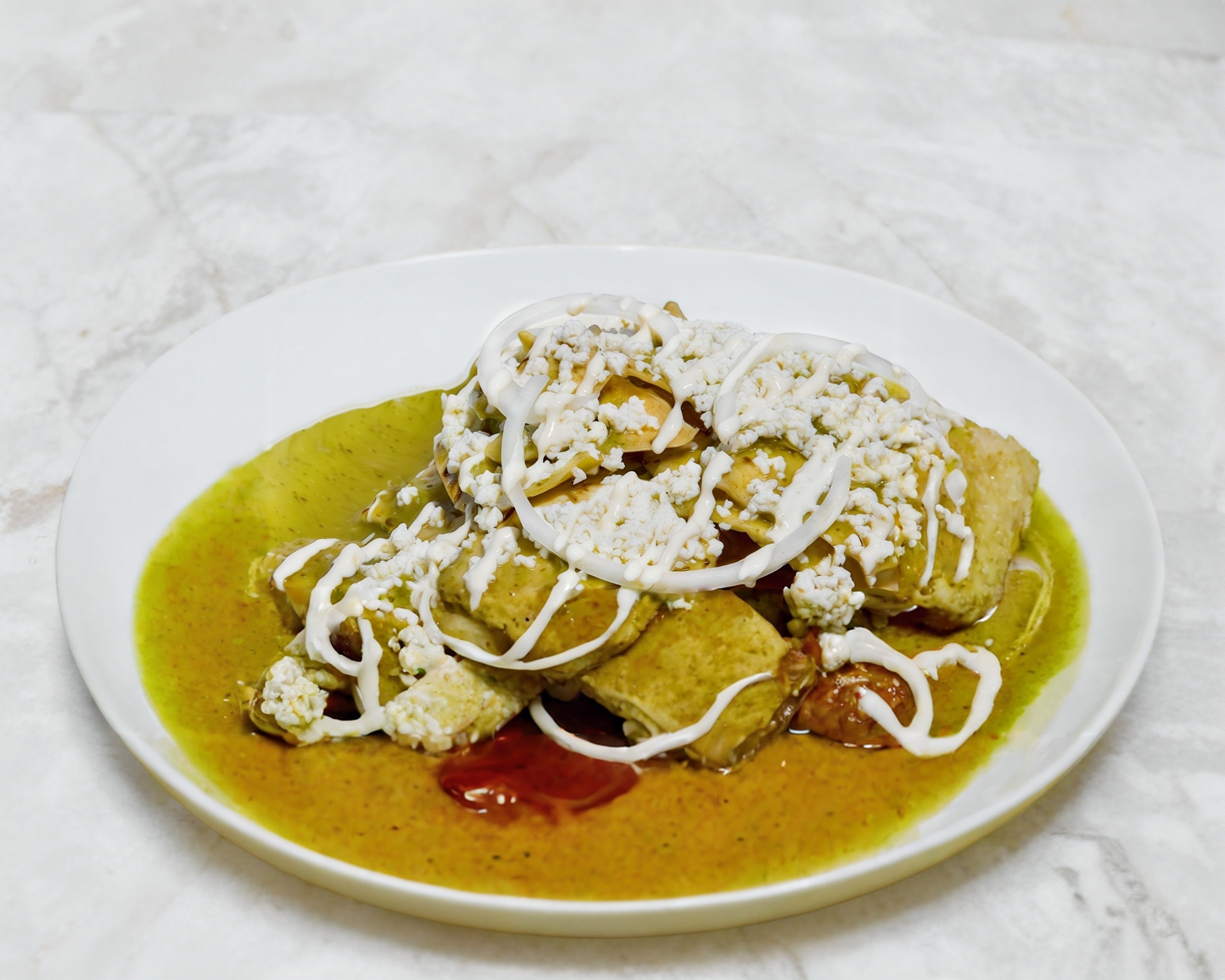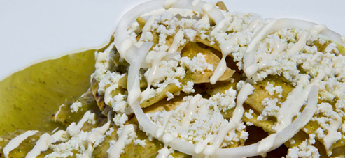 Totopos bañados en salsa verde una pizca de cebolla,queso ,crema acompañados de frijoles. Y un guiso a elegir