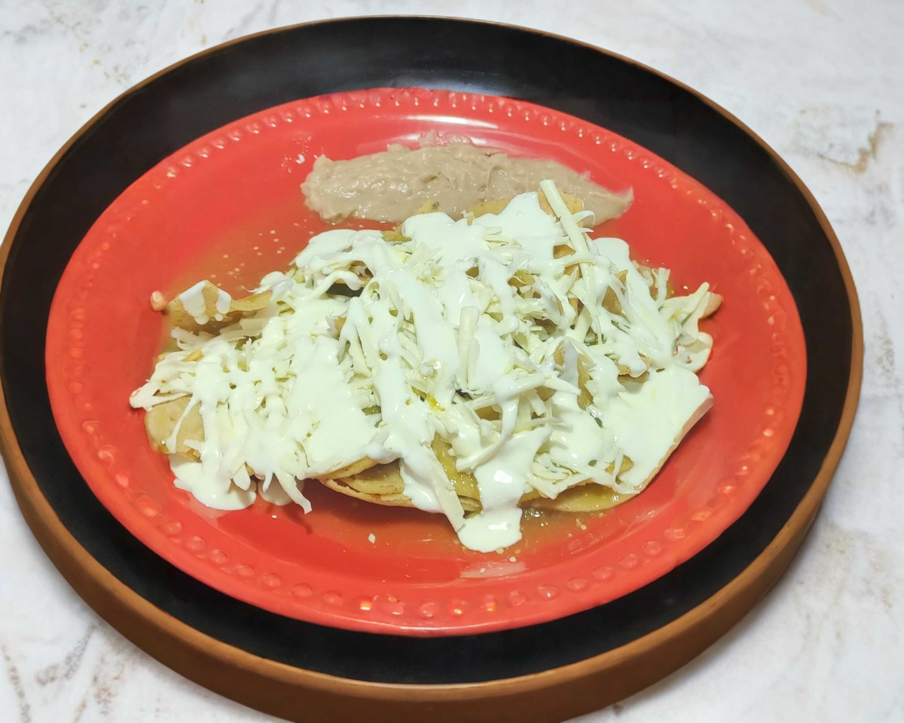Totopos, bañados en salsa verde una pizca de cebolla, queso y crema , acompañados de frijoles refritos.