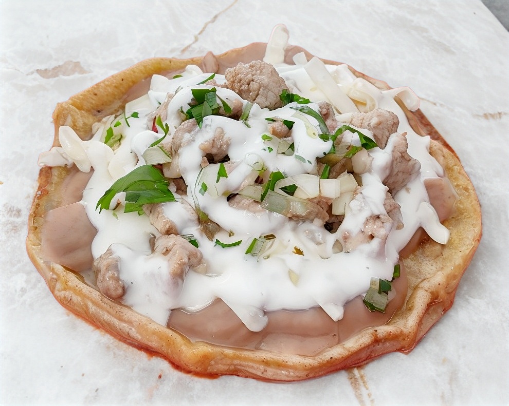Delicioso sope de maíz recién hecho con frijoles, queso y guiso.