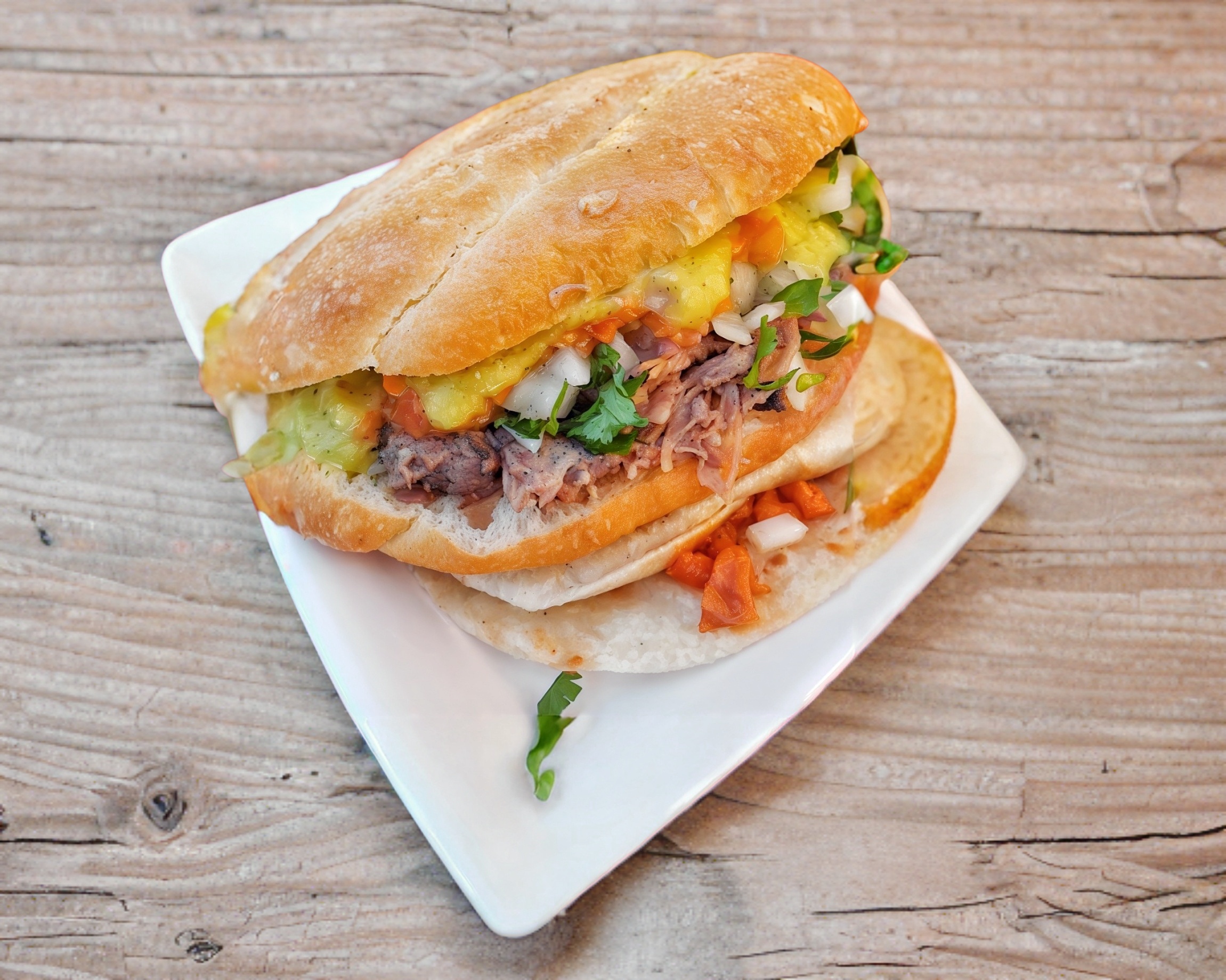 Bolillo con carne de puerco con mayonesa, jitomate, cebolla,queso aguacate y chiles en vinagre.