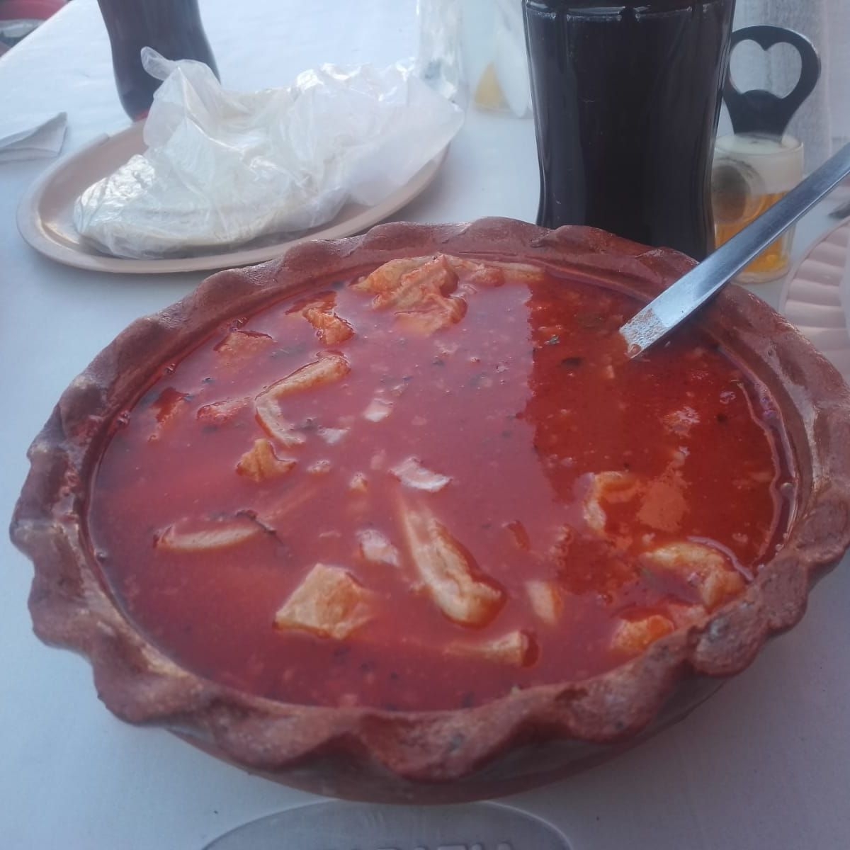 Panza de res con caldo de chile rojo