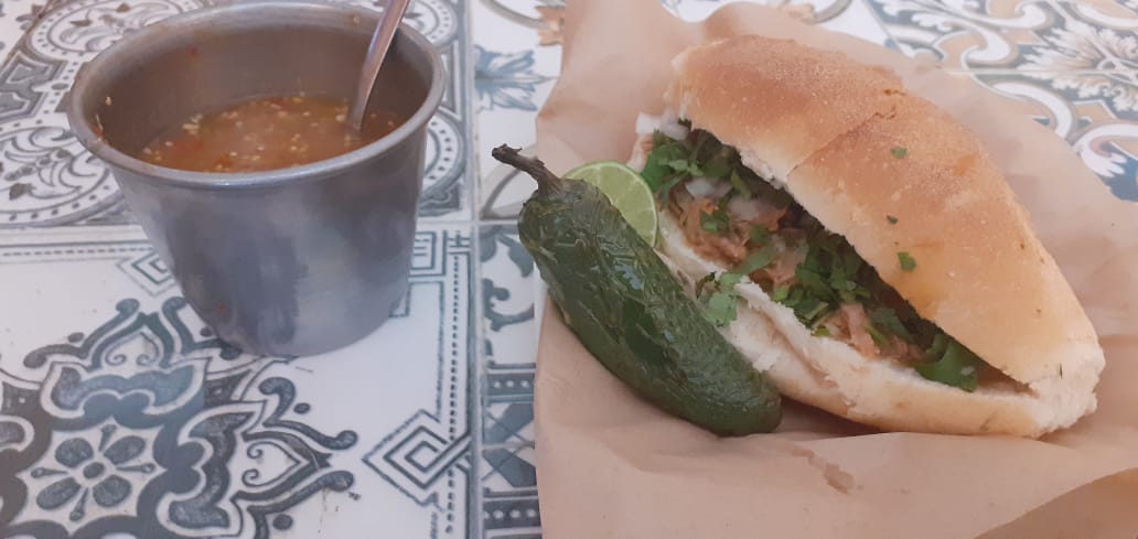 Torta con guiso a elegir, bolillo, con guiso sencillo a elección del cliente, salsa de serrano y jitomate.