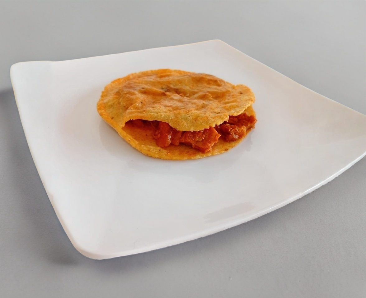GORDITA DE MAIZ RELLENA DE CARNE DESHEBRADA CON CHILE ROJO (NO ES PICOSO)