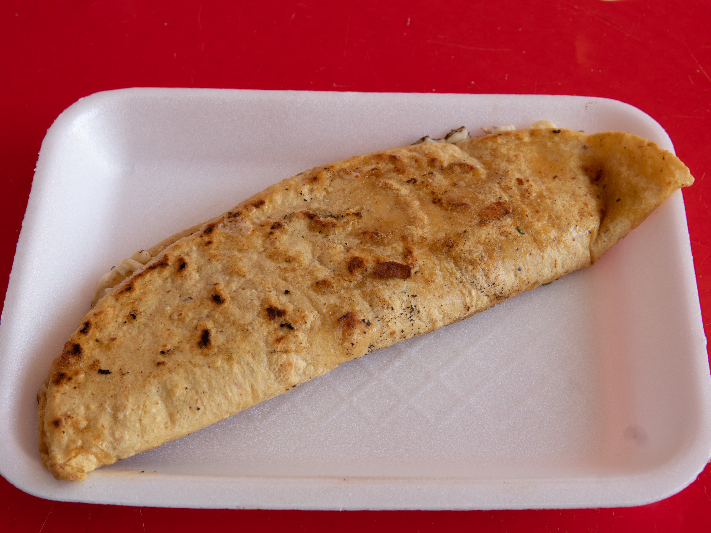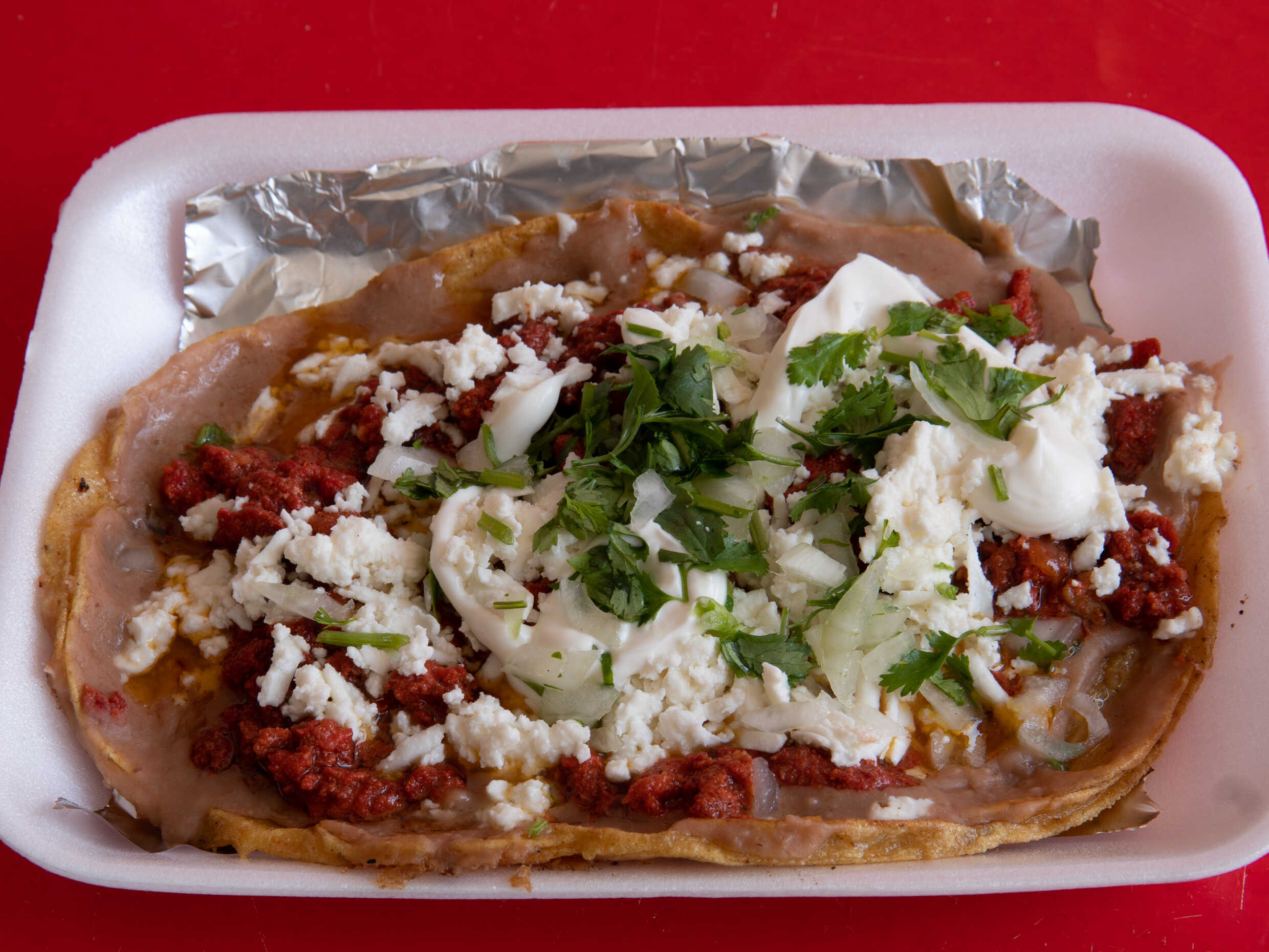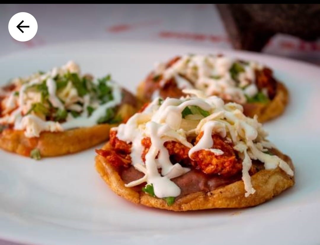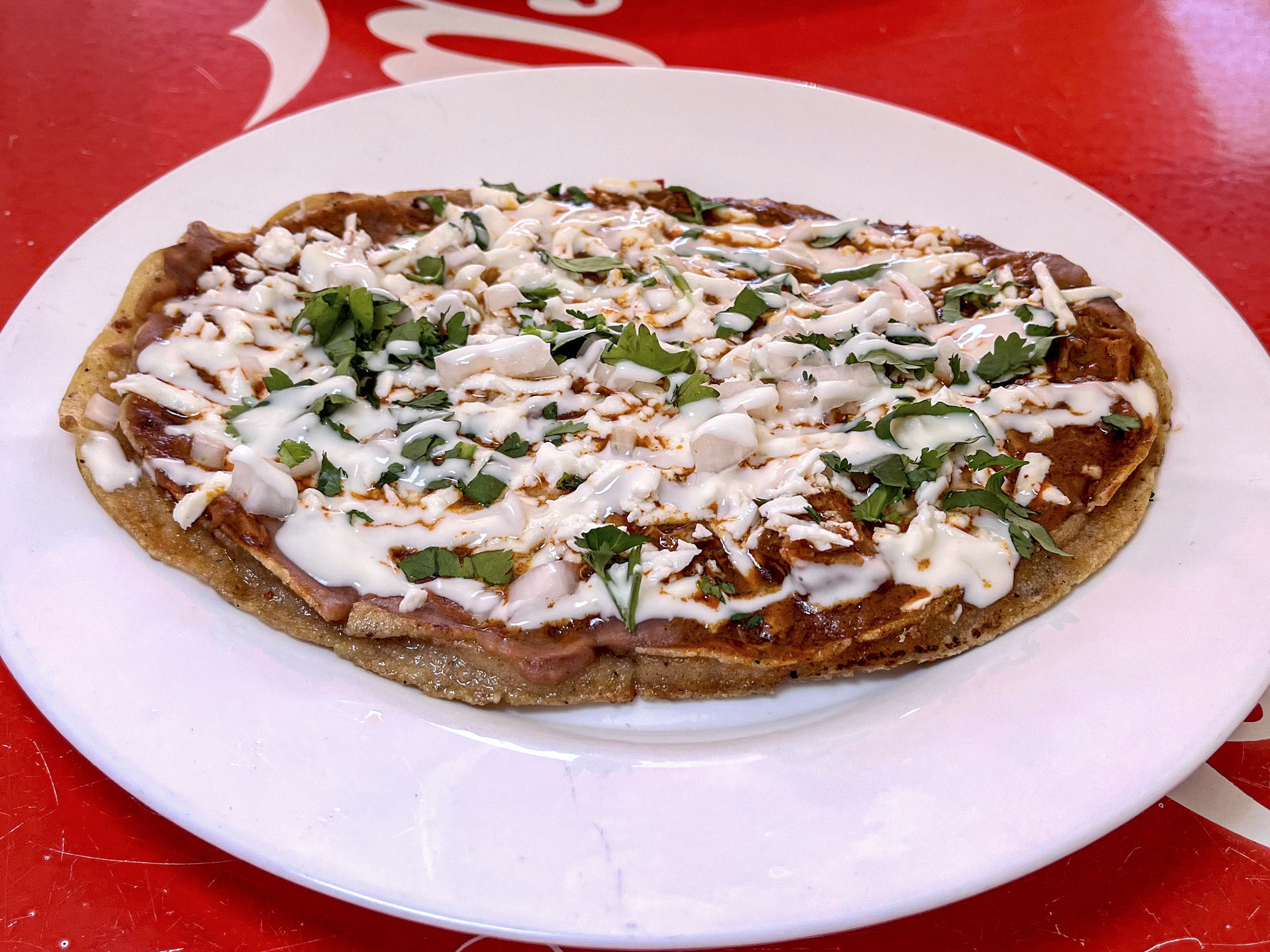 Una porcion para una persona-Base de frijolitos, desebrado con queso, cilantro, cebolla y crema.