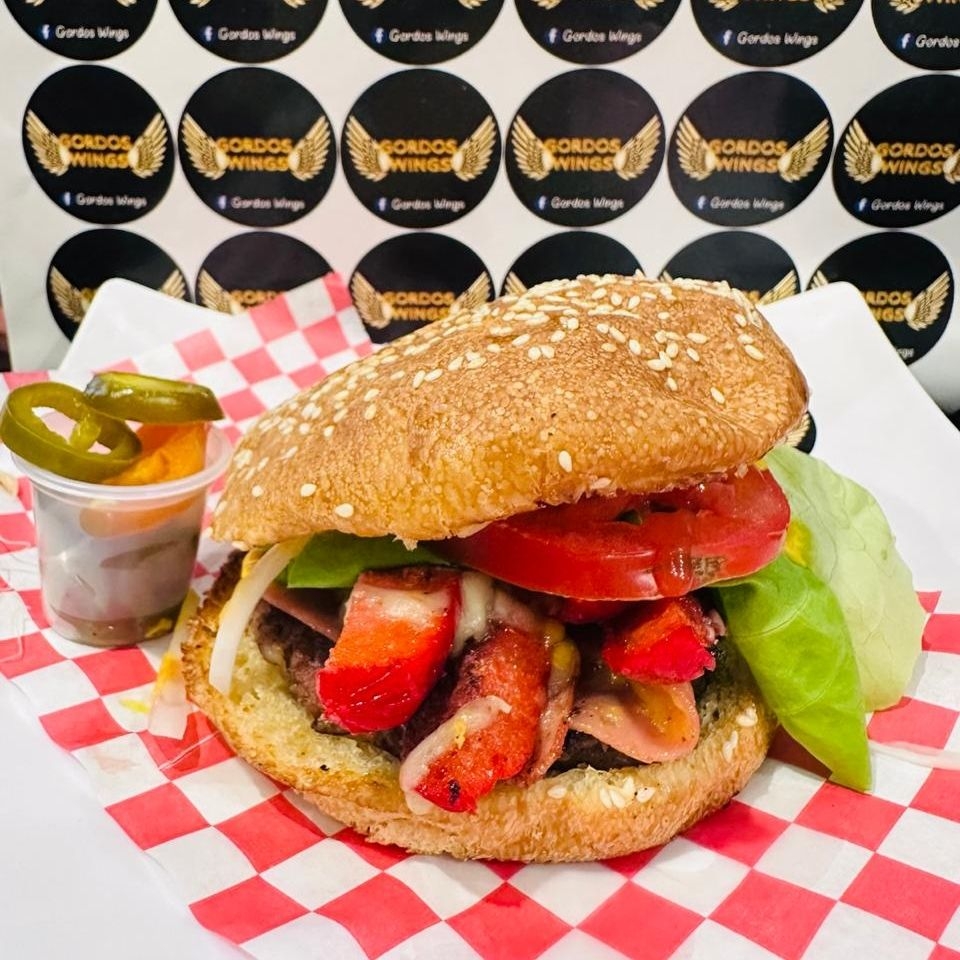 Pan super, carne de res, jamón, queso amarillo, lechuga, jitomate, cebolla, aderezos y porción de papas.