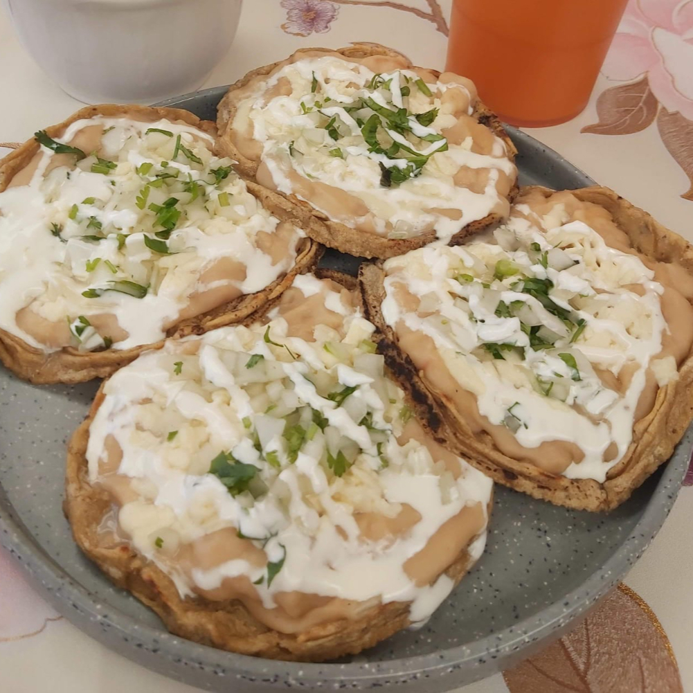 quesadilla de maiz hecha a mano, puede contener alguno de los siguentes guisados: chicharron prensado, tinga de pollo, chuleta a la mexicana, frijoles, papas con pollo, chorizo, desebrada, bistec, rajas y queso.