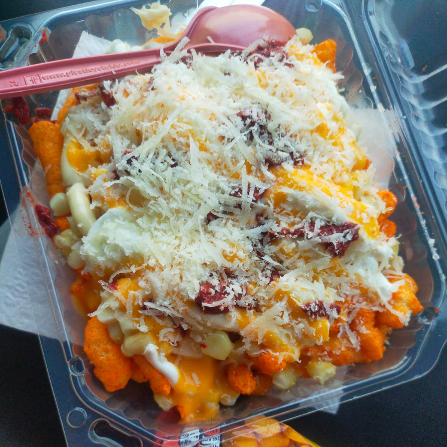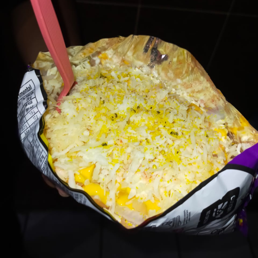 Sabritas a eleccion(Cheetos flaming, doritos nacho, doritos incognita, conchitas, fritos chorizo, tostitos, tostitos flaming y ruffles de queso), se agrega elote desgranado, aderezos(crema, mayonesa, chile, queso amarillo)queso rayado, salsa botanera y salsa casera preparada.