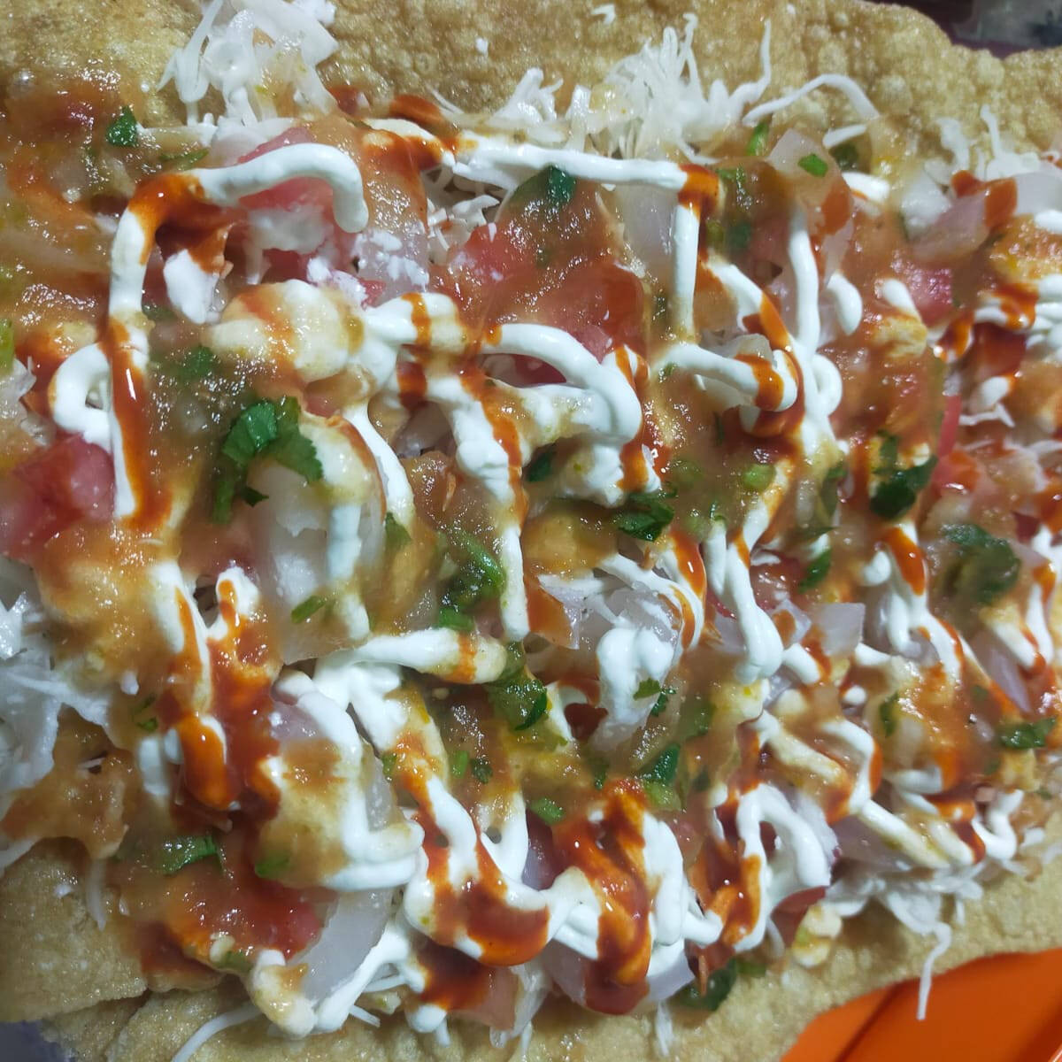 Duro crujiente con repollo rayado, jitomate picado, cueritos, aderezos(crema y chile), se agrega salsa botanera y salsa casera preparada
