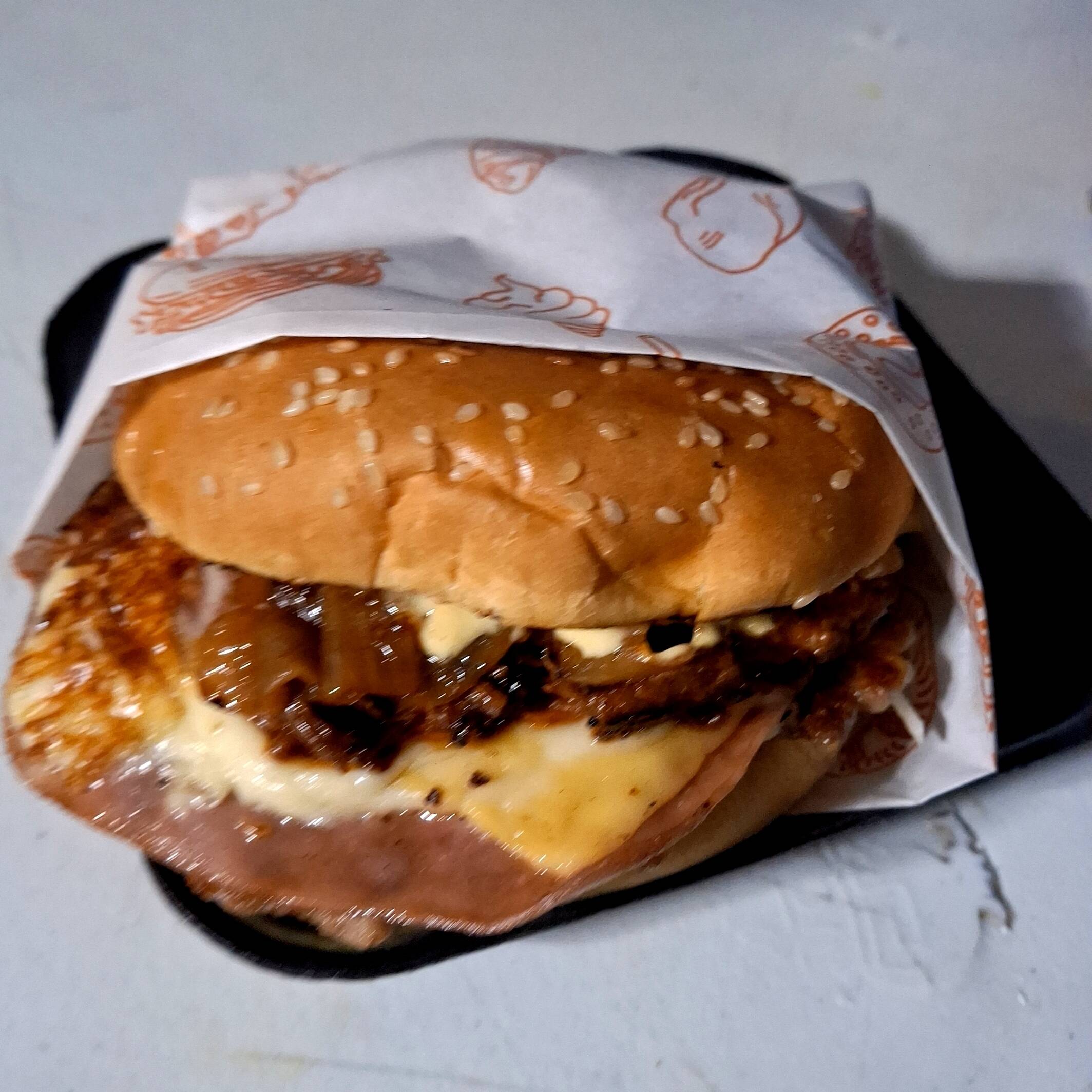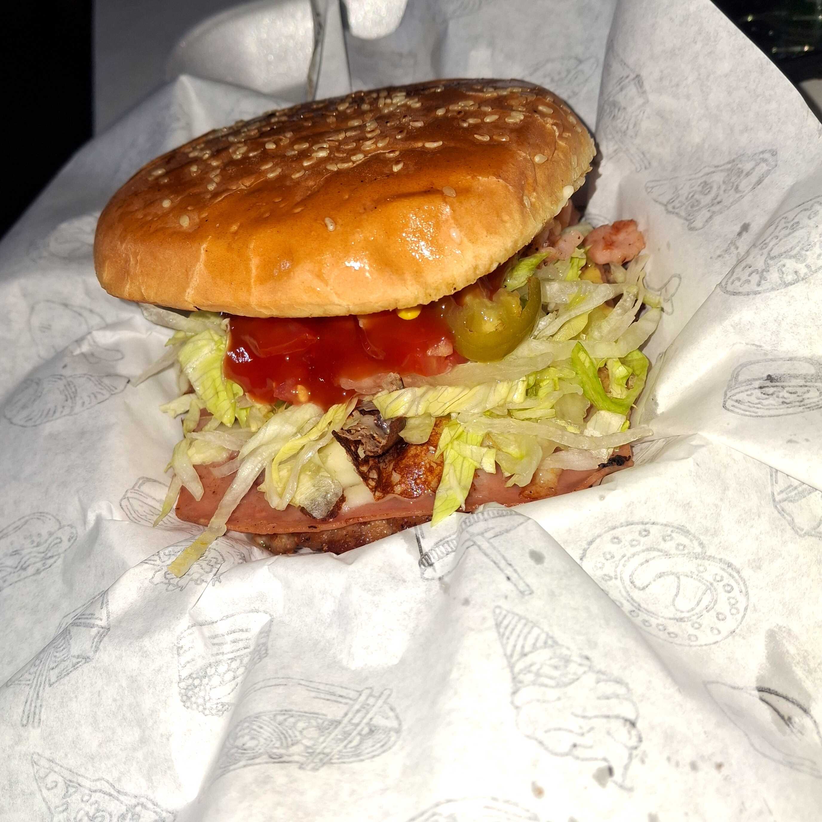 carne, queso, tocino, lechuga, jitomate y aderezos piña y tocino.
