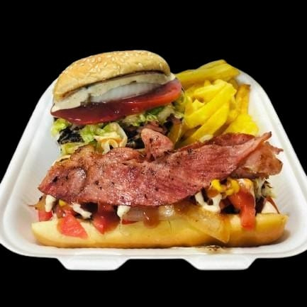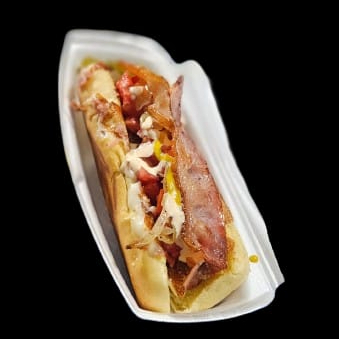Pan de hot dog, salchichon, queso asadero, tocino, jitomate, cebolla asada, chile, catsup, mostaza y aderezo de la casa.