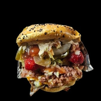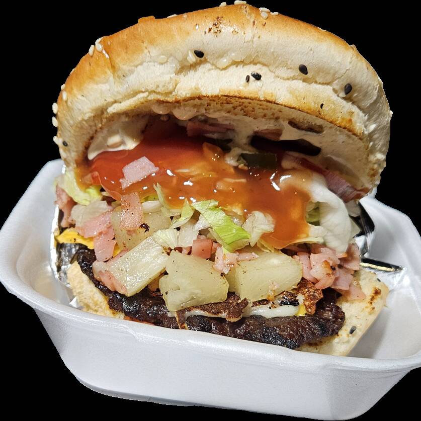 pan tamaño parrillero, carne 100% de res, queso asadero, queso amarillo, jamon, tocino, 2 piñas, salchichon, lechuga, jitomate, cebolla asada, chile, catsup, mostaza, y aderezo de la casa.