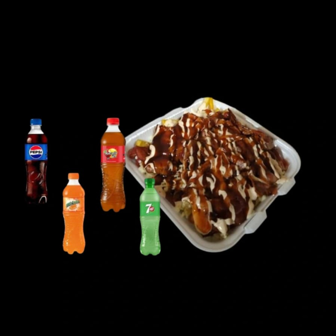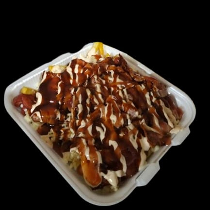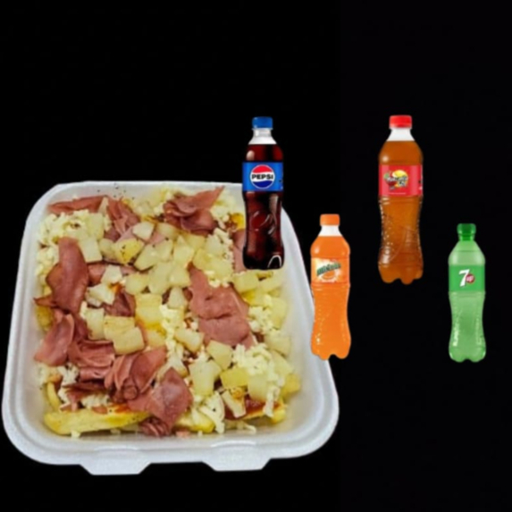 Papas salpikmentadas con sal, salsa especialm de pizza, queso asadero, jamon, piña, catsup, bbq, queso amarillo, salsa valentina y aderezo de la casa.
