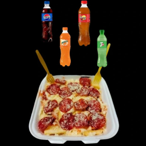Papas a la francesa salpimentadas con sal, salsa especial de pizza, queso asadero, pepperoni, aderezo de la casa, catsup, bbq, salsa valentina y aderezo de la casa