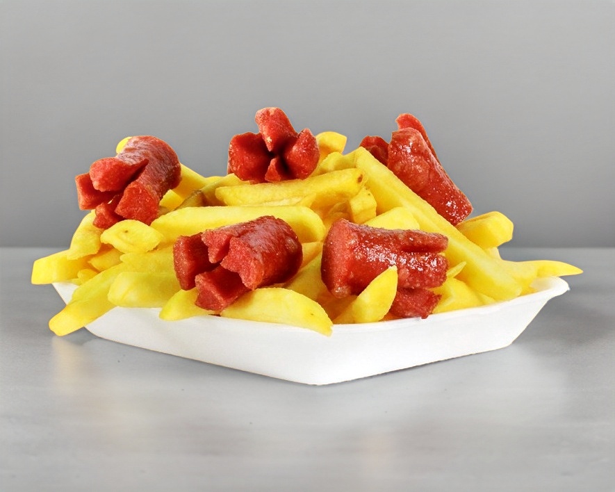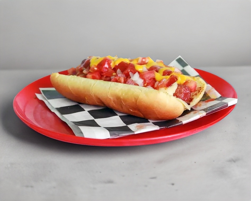Salchicha acompañada de queso asadero, tocino, jitomate, cebolla, cátsup y mostaza.