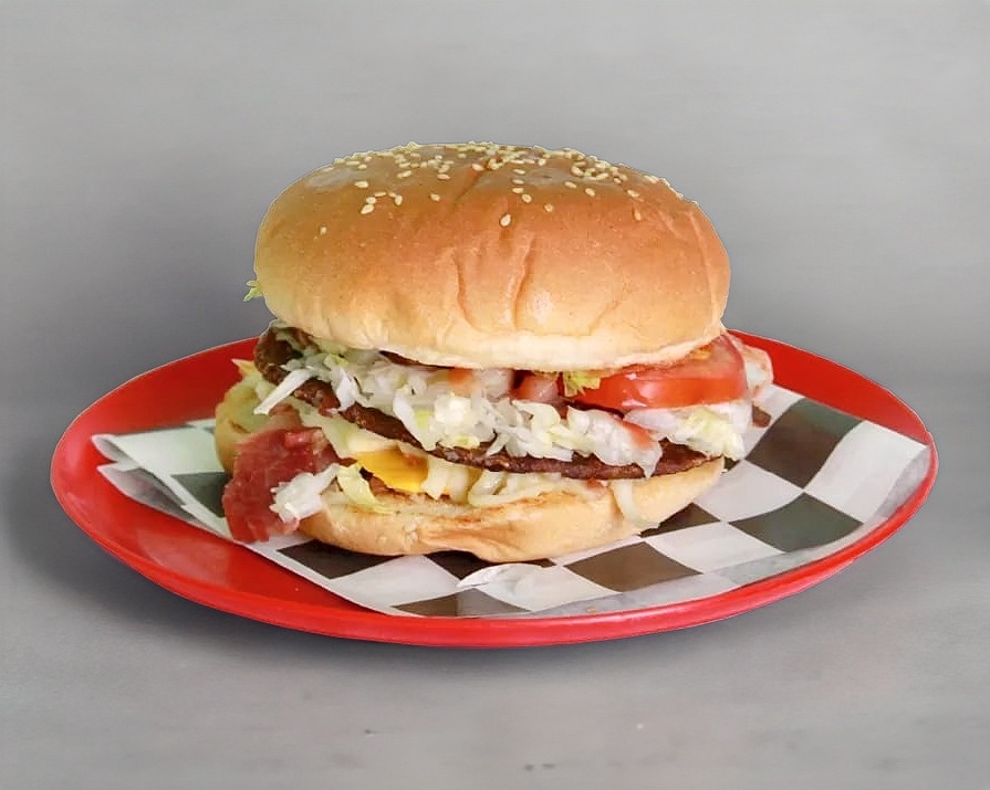Carne de res acompañada de queso asadero, queso amarillo, tocino, lechuga, jitomate, cebolla, cátsup y mostaza.
