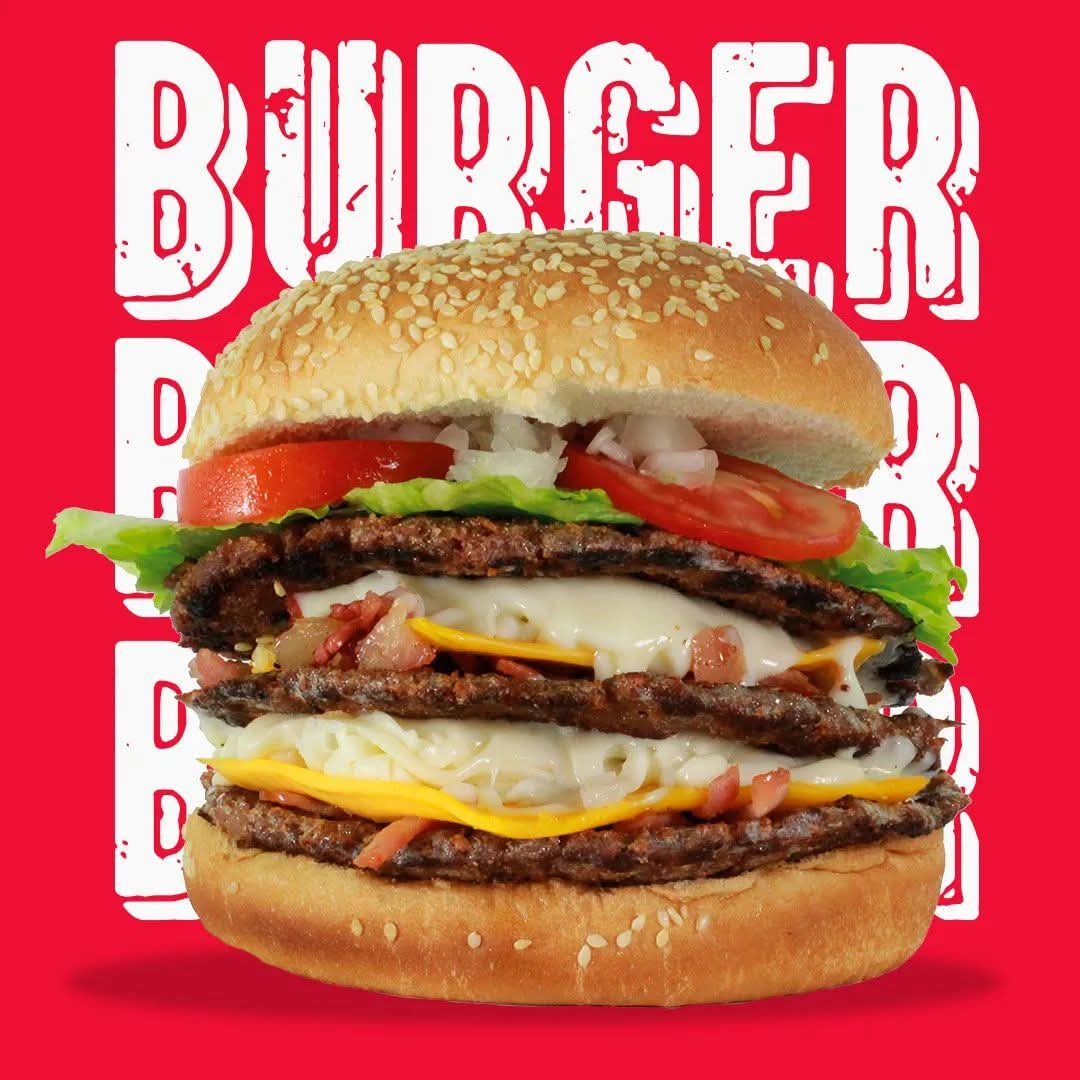3 carnes doble porcion de queso asadero de amarillo y tocino verduras jitomate leghuga cebolla chiles capsu y mostasa