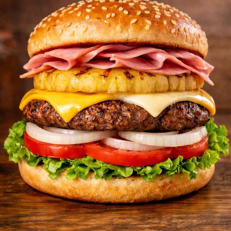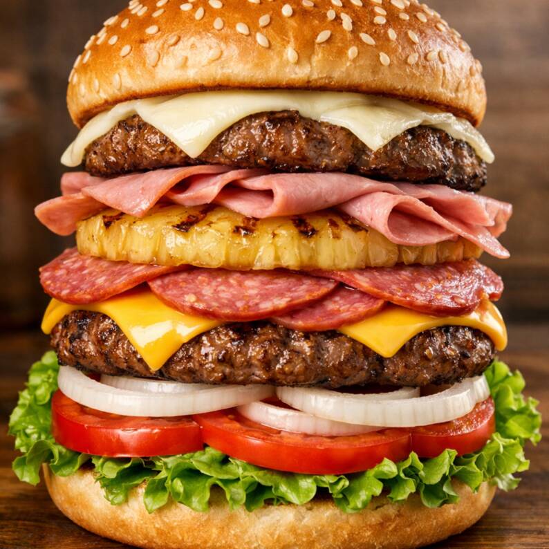 DOBLE CARNE DE RES, SALCHICHÓN, PIÑA, JAMÓN, QUESO AMERICANO Y MANCHEGO, VERDURAS Y ADEREZOS