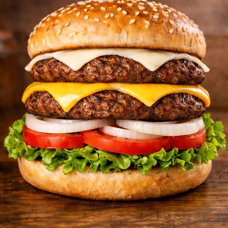 DOBLE CARNE DE RES, QUESO AMERICANO Y MANCHEGO, VERDURAS Y ADEREZOS