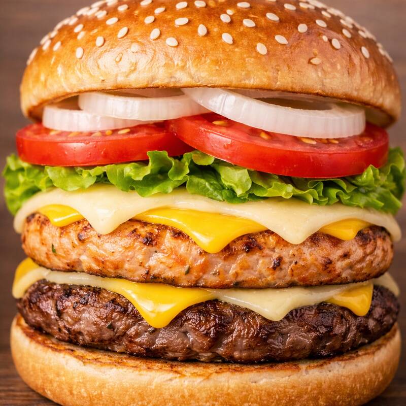 CARNE DE RES, TOCINO, QUESO AMERICANO Y MANCHEGO, VERDURAS Y ADEREZOS