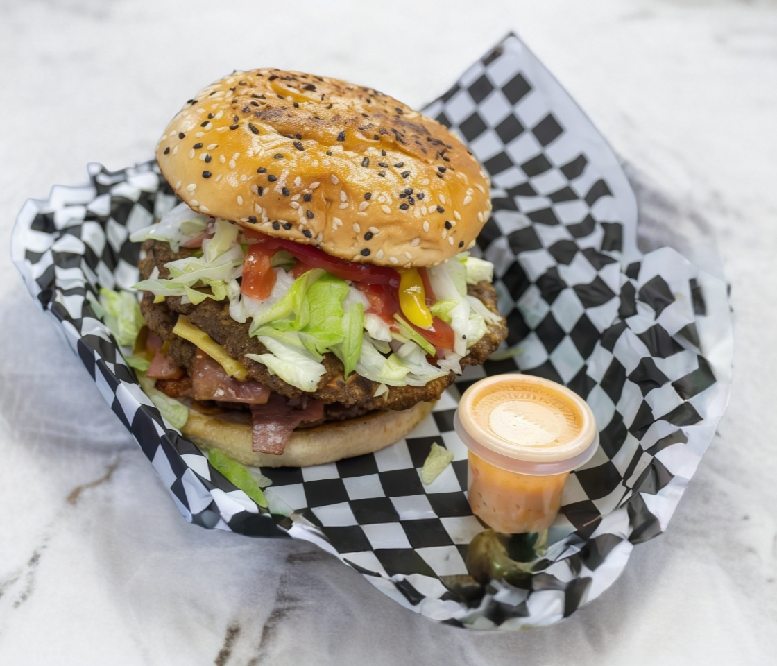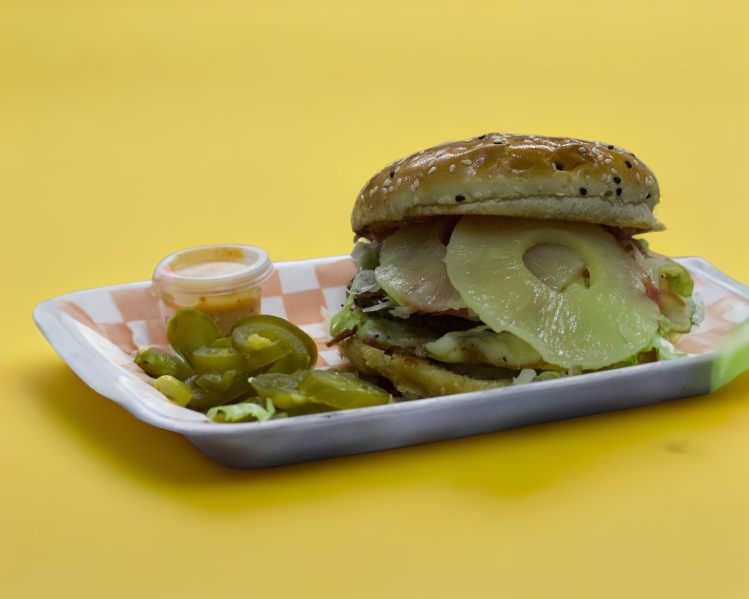 Hamburguesa de carne de res acompañada con queso asadero, queso amarillo, tocino, piña, lechuga, jitomate, cebolla, cátsup y mostaza.