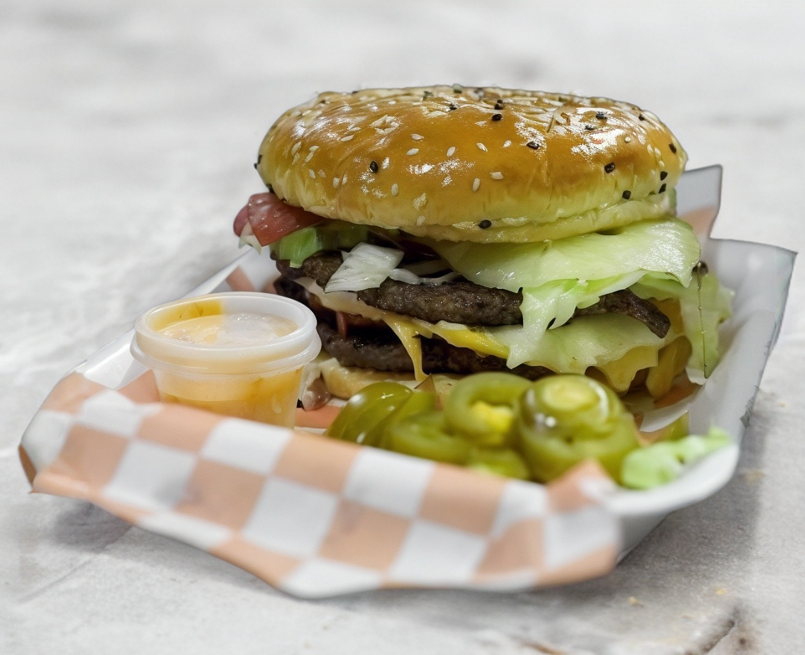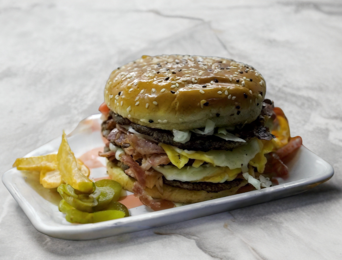 Triple carne de res y queso amarillo acompañada con doble porción de queso asadero y tocino, lechuga, jitomate, cebolla, cátsup y mostaza.
