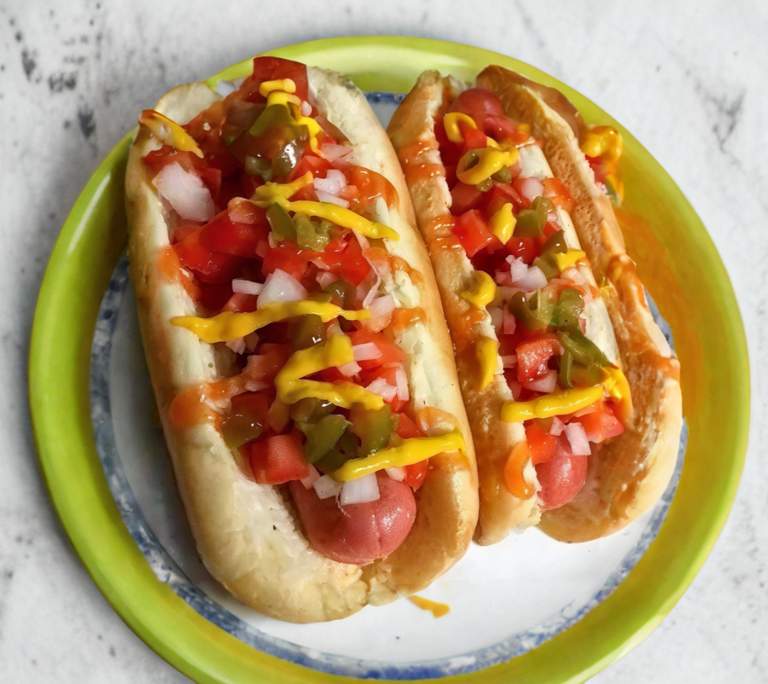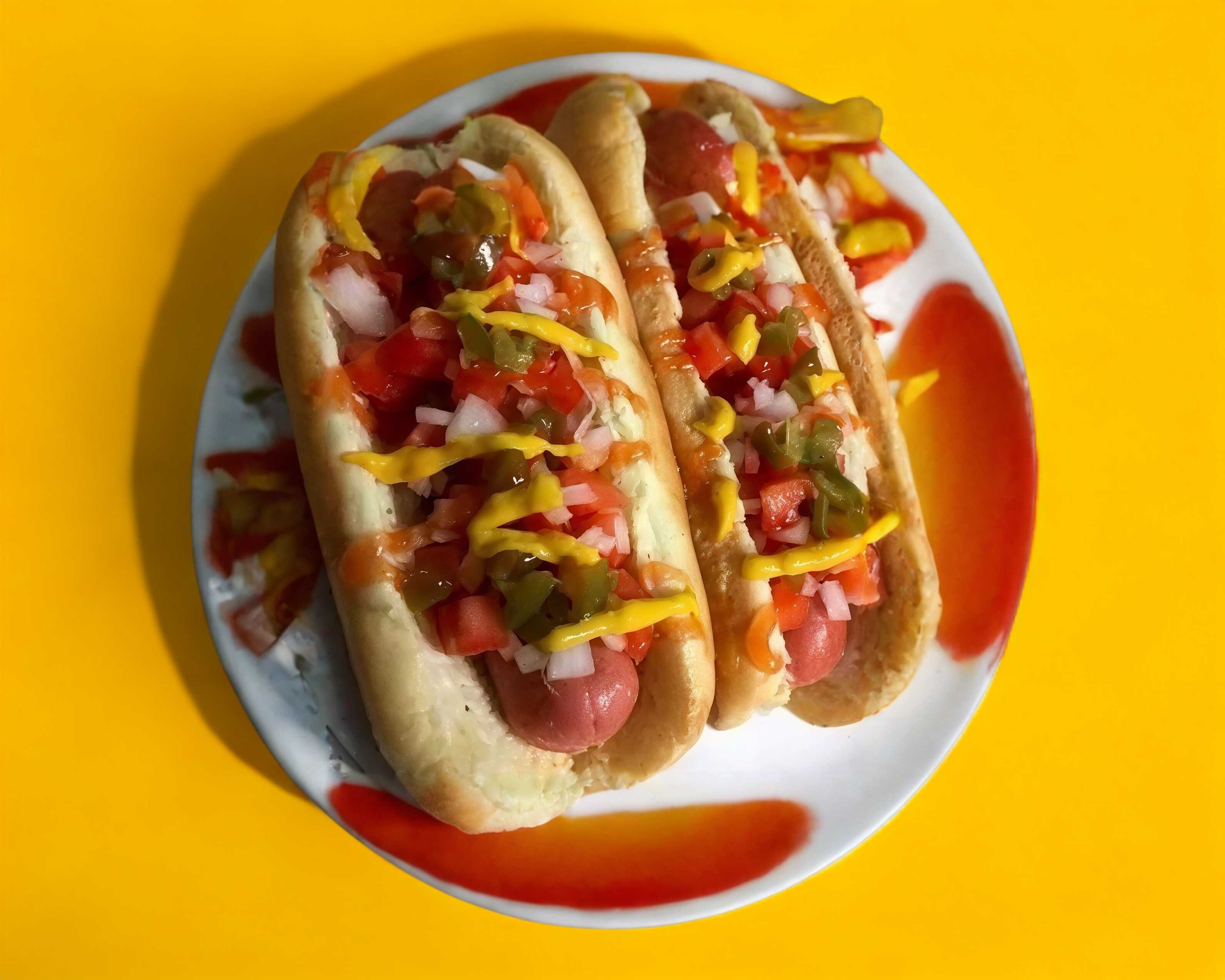 Salchicha en pan acompañada de tocino, queso asadero, jitomate, cebolla, cátsup y mostaza.