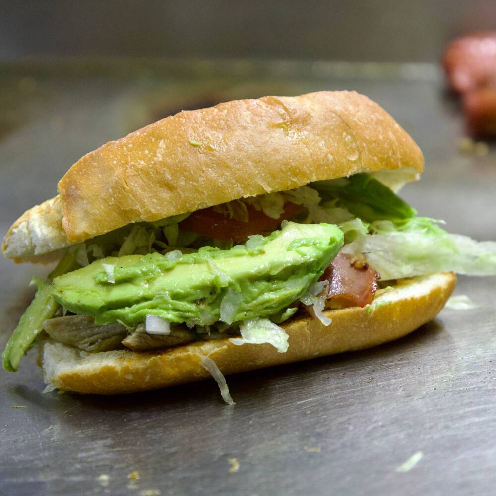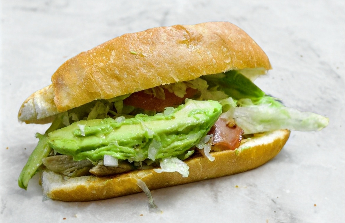 Bolillo acompañado de jamon, queso asadero, queso amarillo, mayonesa, lechuga, jitomate, cebolla y aguacate