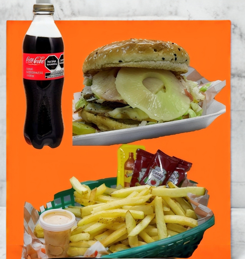 Doble carne de res acompañada con queso asadero, queso amarillo, tocino, piña, lechuga, jitomate, cebolla, cátsup y mostaza.