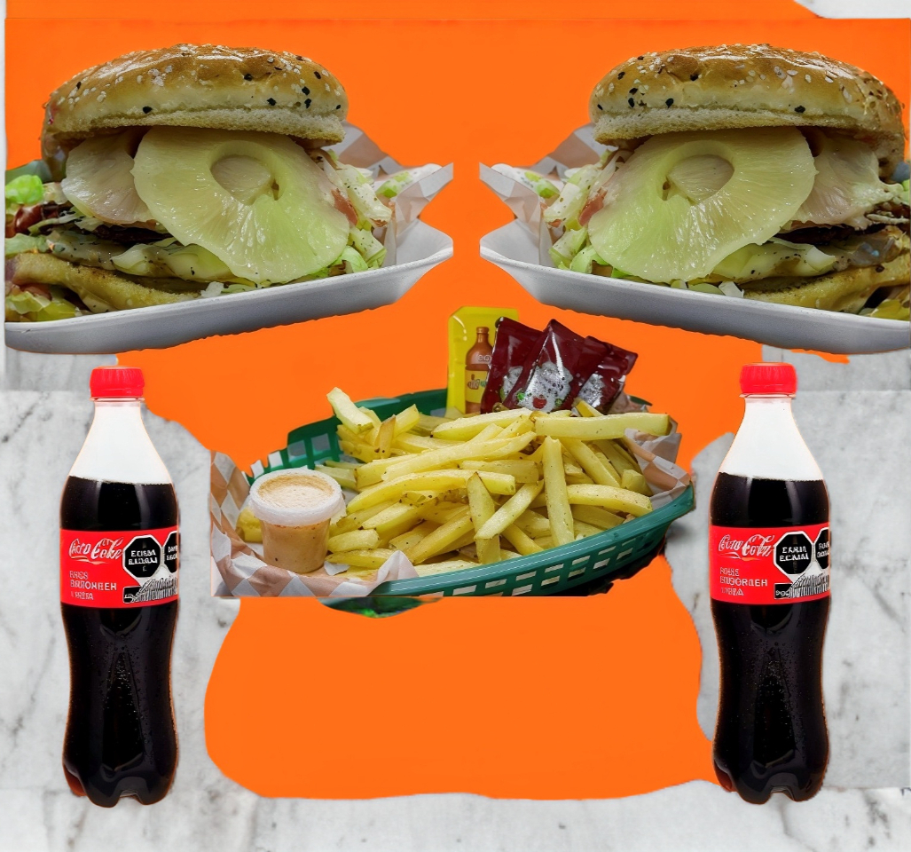 COMBO 10: 2 HAMBURGUESAS HAWAIANAS, PAPAS Y 2 REF