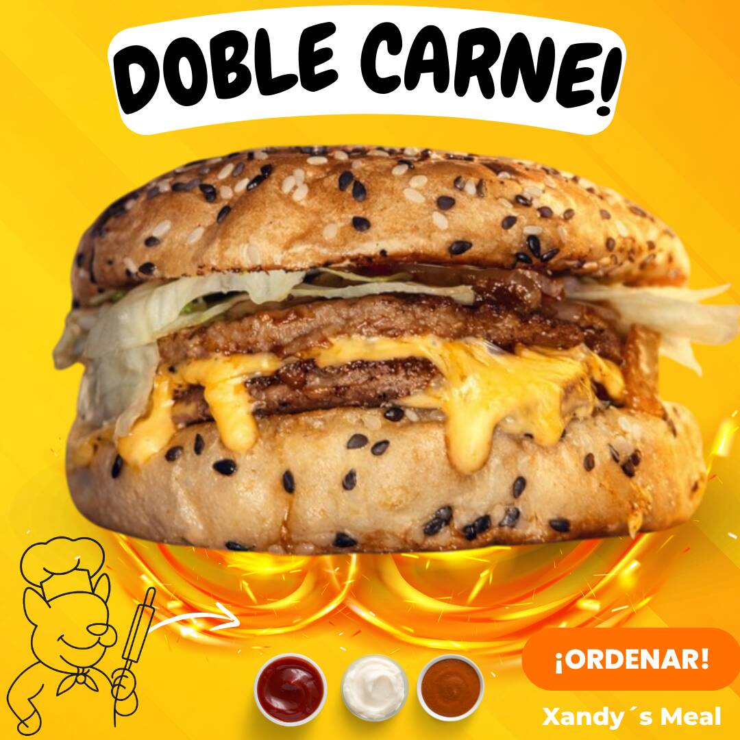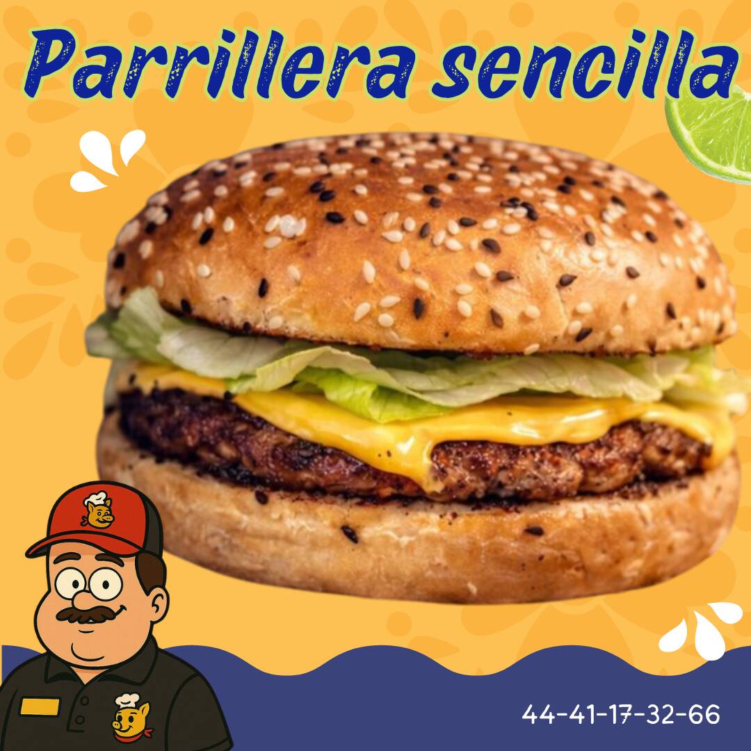 Pan Parrillero , doble carne de hamburguesa , queso amarillo , mayonesa , lechuga , tomate , cebolla , catsup.