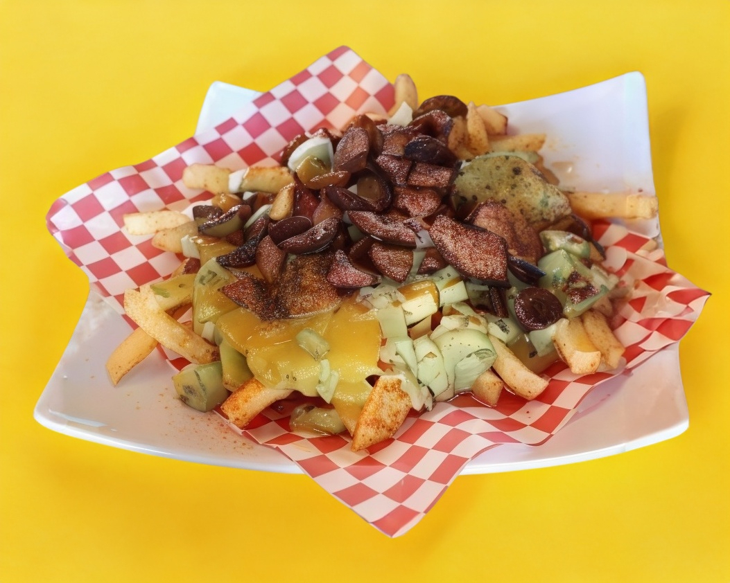 Papas a la francesa con queso amarillo, queso parmesano, nuestro famoso aderezo picante y trozos de arrachera.