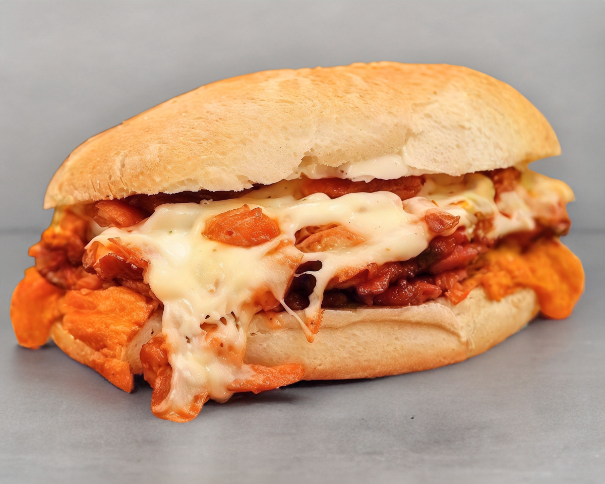 Un bolillo (partido a la mitad) con bistec y queso.