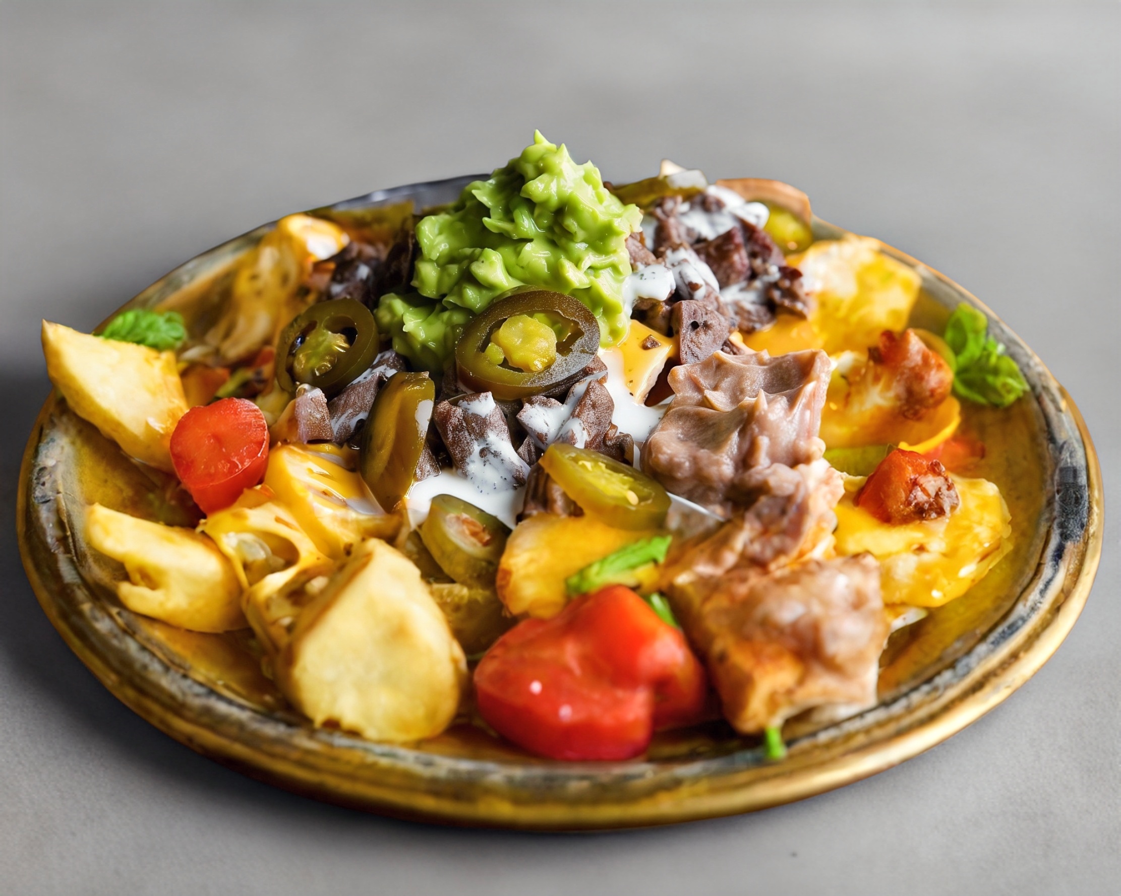 100 Gramos de totopo con carne de arrachera, acompañado de queso amarillo fundido, frijoles y chiles jalapeños.