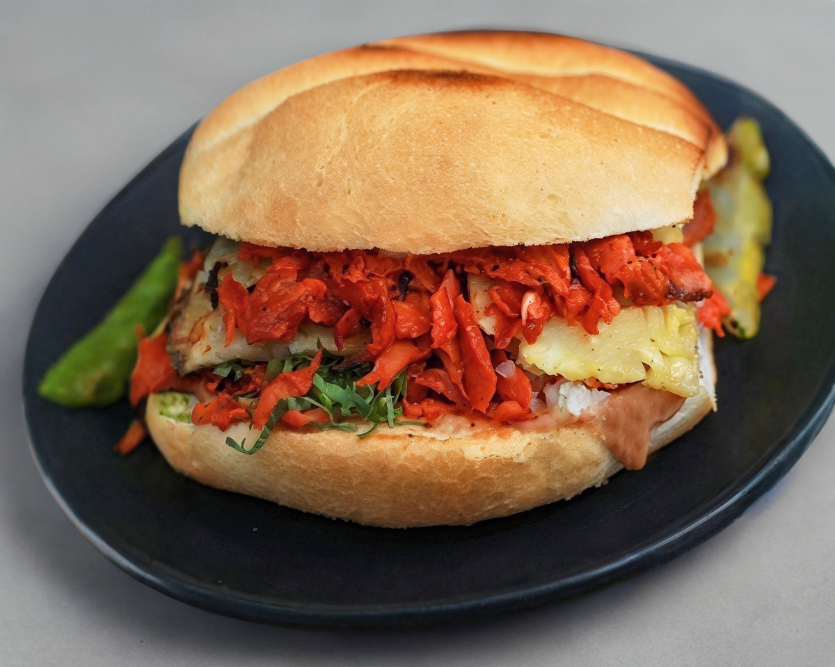 Bollo con carne de res, queso asadero y amarillo, jamón y tocino, piña, aderezos y verduras.