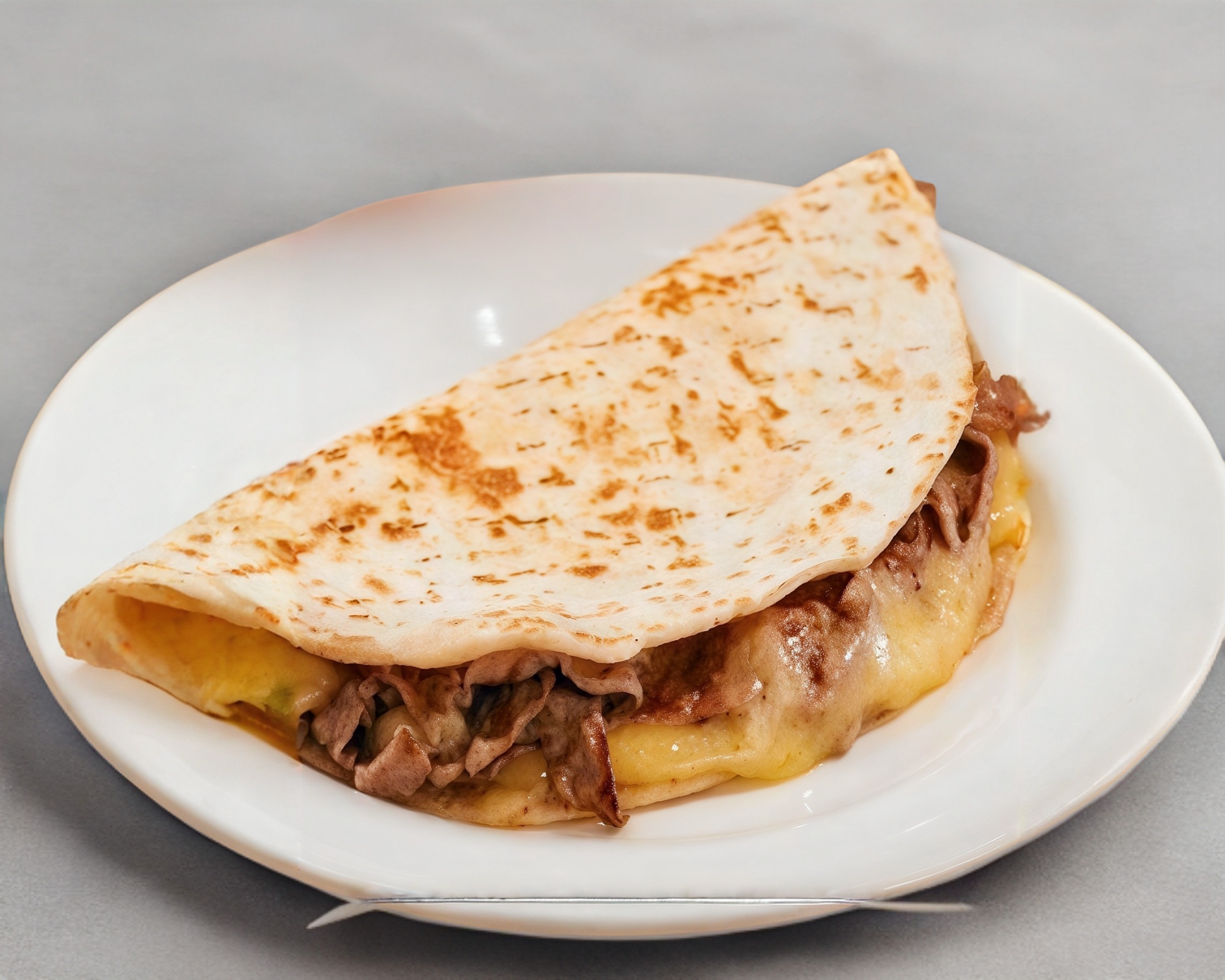 Tortilla de harina chica (doblada a la mitad) con bistec y queso.