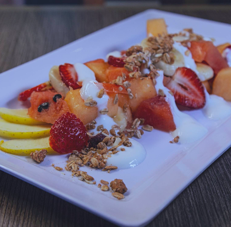 Selección de frutas de temporada, acompañada de granola, yogurth natural orgánico y miel de abeja