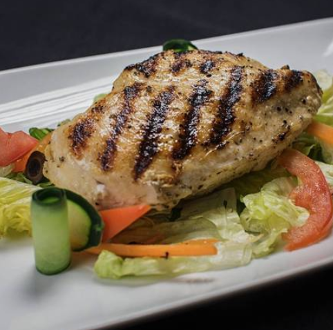 Basta pechuga de pollo a la parrilla sazonada de la Casa acompañada sobre una cama de lechuga, pepino, zanahoria, cebolla morada y jitomate cherry .