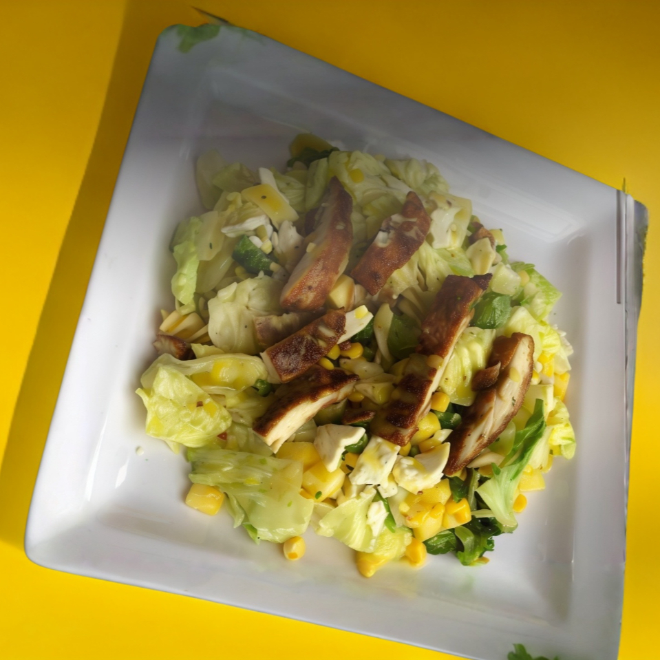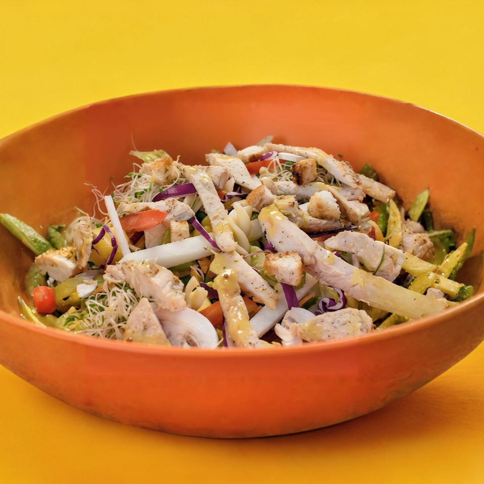 Rico sabor dulce en tu ensalada acompañada con crujientes fajitas de pollo, piña, elote, brócoli, pasta, queso panela y aderezo mostaza miel.