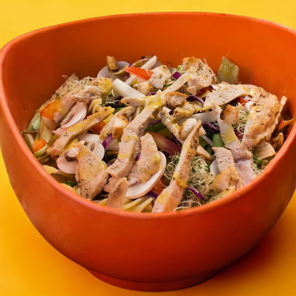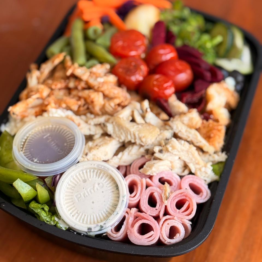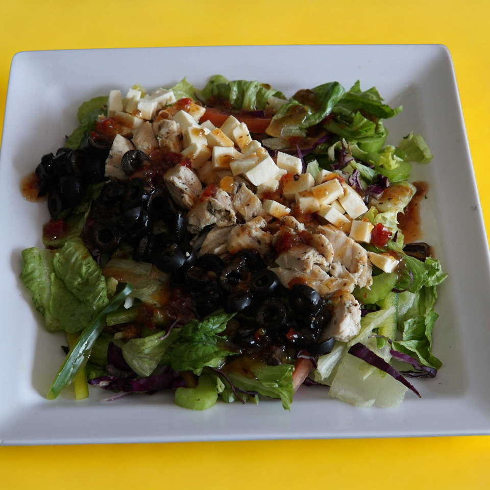 Ensalada agridulce en combinación de pollo, queso panela, aceituna negra, col morada, pimiento morón, cebolla morada, apio, jitomate cherry, acompañada de vinagreta italiana.