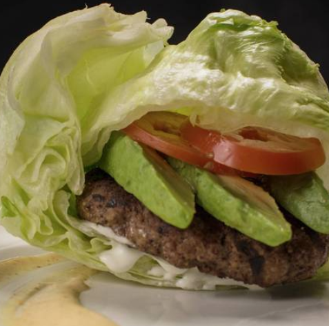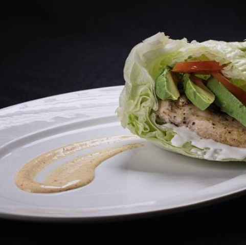 Totalmente nutritiva hamburguesa de pollo, acompañada con jitomate, aguacate, cebolla y aderezo. Dentro de una fresca lechuga iceberg, en lugar de pan ideal para esa dieta.