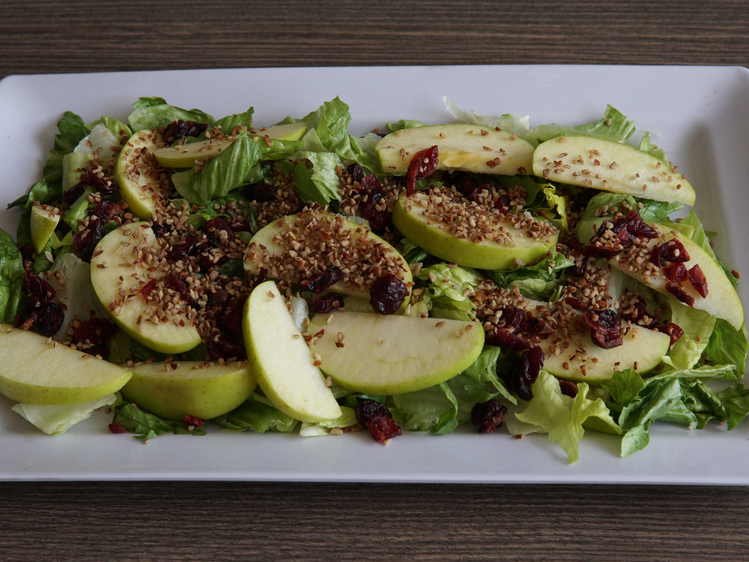 Inigualable ensalada ligera, con destellos de sabores manzana, arándanos, nuez, lechuga, y vinagre balsámico, llena de vitaminas para ti.