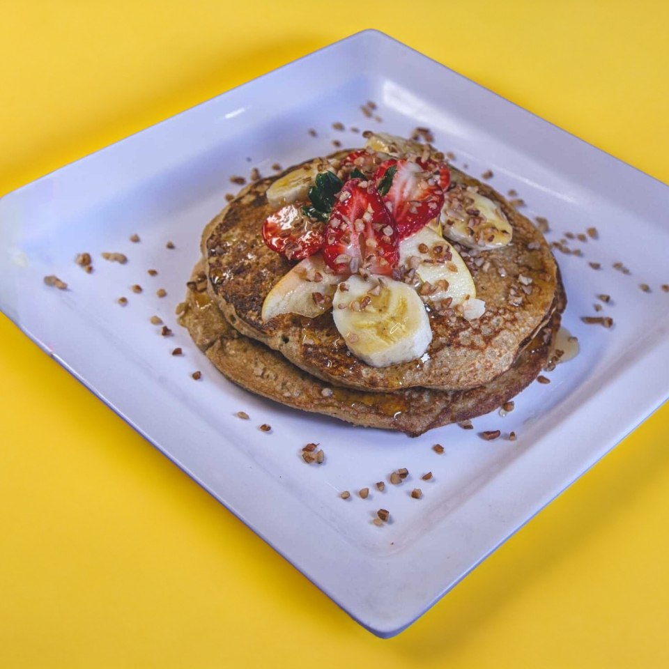 Hot Cakes a base de harina de Avena y plátano, acompañados de fruta de temporada y miel de abeja, una exquisita y saludable elección!!!!, incluye una bebida