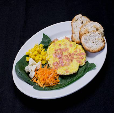 Deliciosa torta de huevo acompañada de queso panela, verdura fresca y pan tostado.