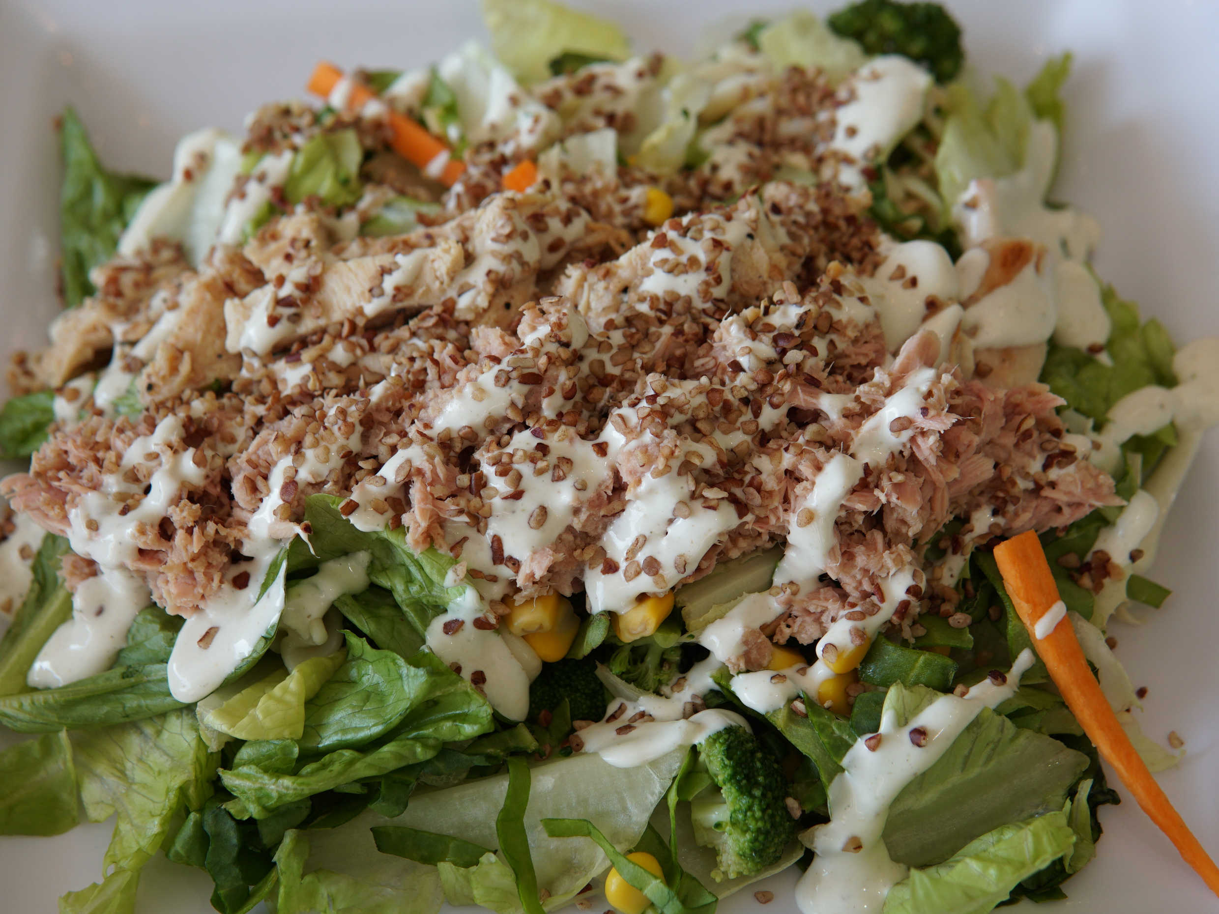 Ensalada rica en proteínas, elaborada con atún, pechuga de pollo, nuez, espinaca, pasta, brócoli, zanahoria y aderezo Ranch, rica de principio a fin. Ideal para esas personas que van al Gym.