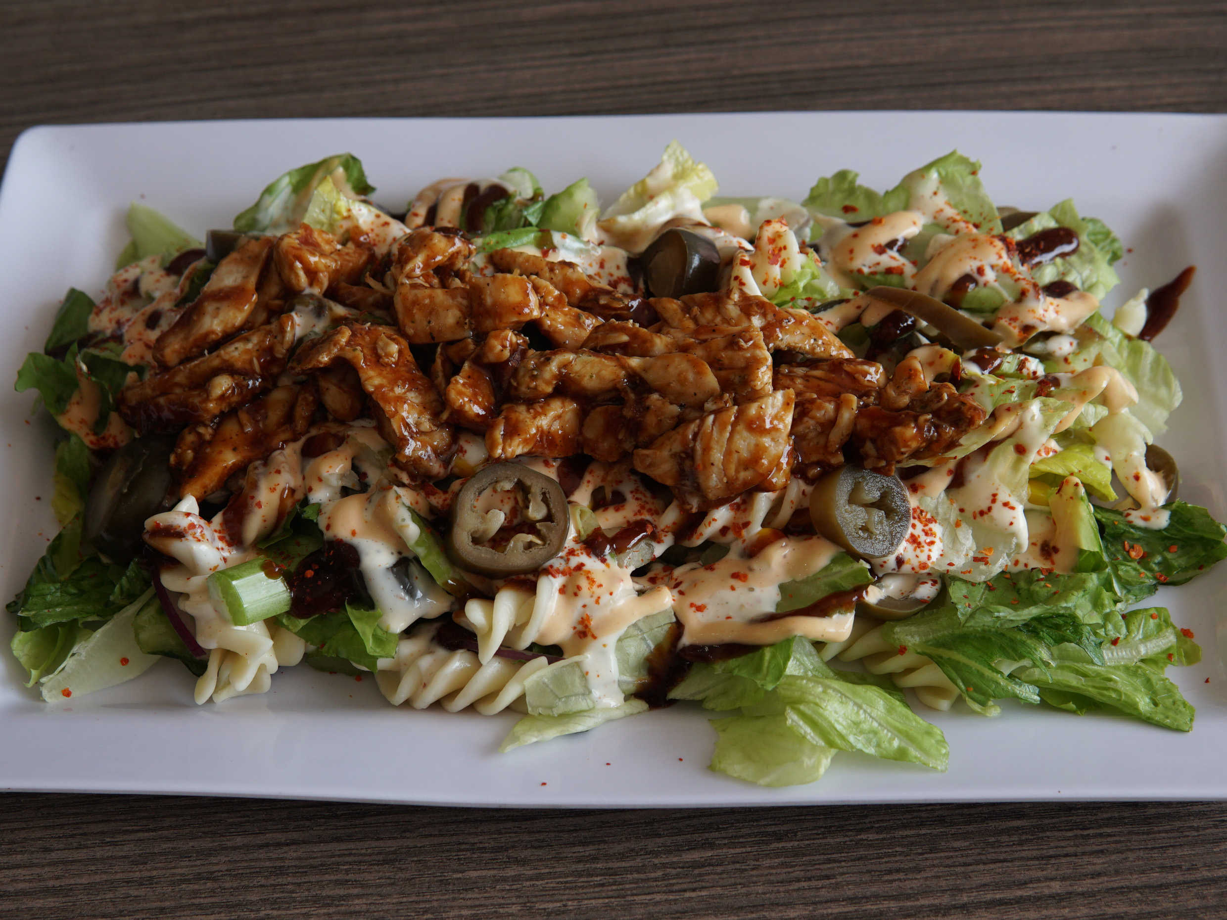 Adictiva ensalada picante, pasta, jalapeño, apio, elote, cebolla morada, pollo BBQ, aderezo, chipotle, chimichurri, salsa BBQ y un toque de chile quebrado, repleta de explosivo sabor delicioso.
