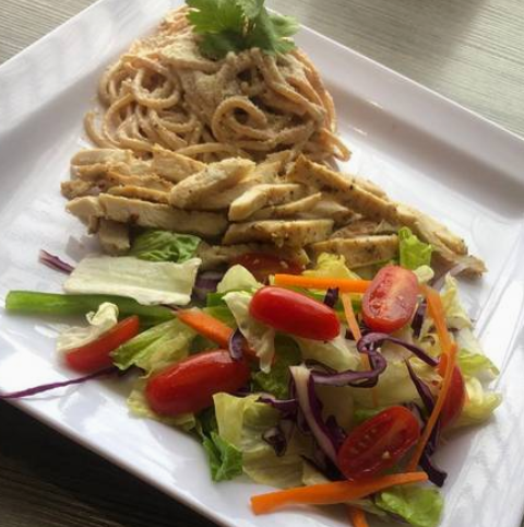 Exquisita pechuga y queso panela a la plancha, en una cama de lechuga, acompañada de pasta al cilantro y verduras salteadas, una combinación deliciosamente saludable.