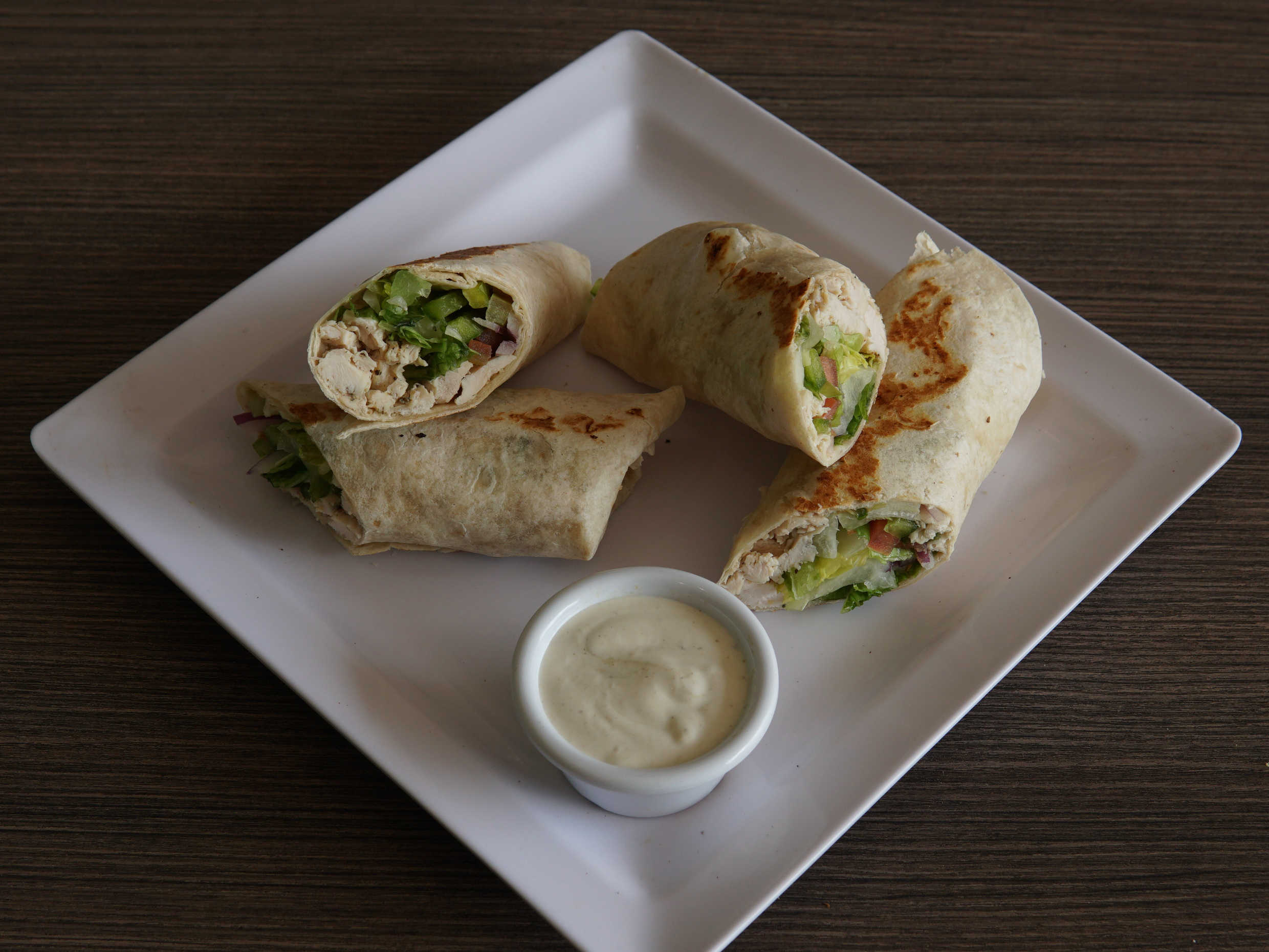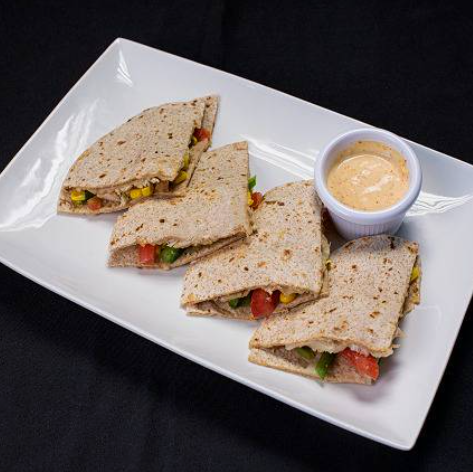 1 Sincronizada dividida integral con pollo natural y verduras, acompañada con queso manchego y aderezo.