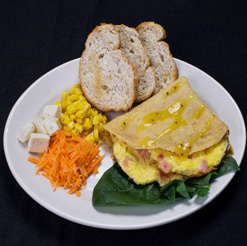 Deliciosa crepa con opción de relleno entre huevo y pollo, acompañada con verdura pan tostado y queso panela.