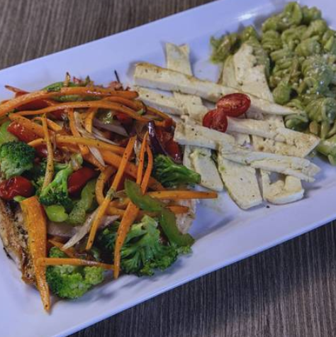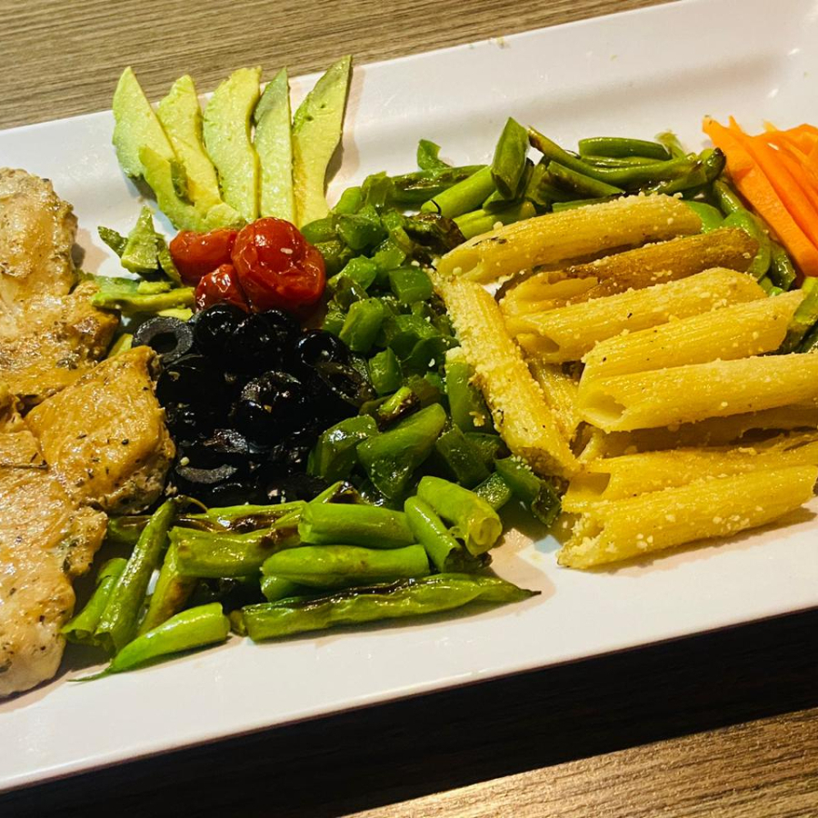 Pechuga de Pollo (150gr) especiado con sal y finas hierbas, Pasta Fusilli, Mantequilla, ejote, morrón, jitomate Cherry, aceitunas negras, zanahoria, acompañado de aguacate