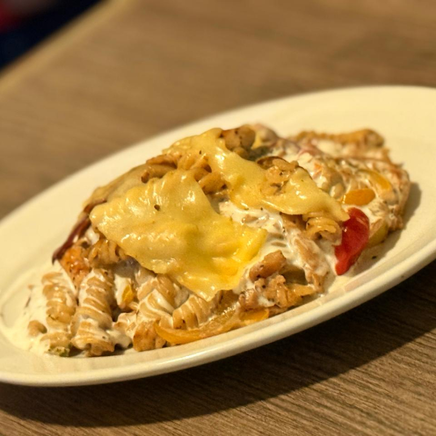 Pechuga de Pollo en trozos (150grm) con jitomate Cherry, morrón, Champiñón, brócoli, cebolla morada, salpimentados y salteados con aceite de oliva con pasta, crema y queso gouda gratinado